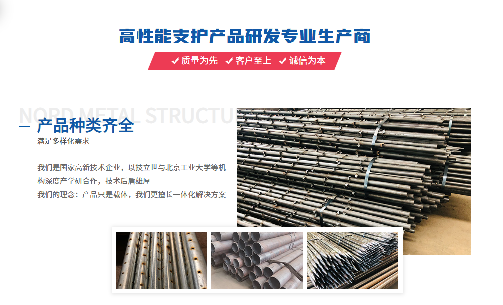 山東諾德金屬結(jié)構(gòu)有限公司主營(yíng):注漿管,鋼花管,中空錨桿,超前小導(dǎo)管,管棚管.是一家專業(yè)從事礦山巷道、隧道、邊坡、基坑等工程支護(hù)與加固技術(shù)服務(wù),支護(hù)材料研發(fā)與生產(chǎn)的高新企業(yè),坐落于美麗的江北水城-聊城。注冊(cè)資本2000萬(wàn)。公司自成立以來(lái),一直致力于高性能支護(hù)產(chǎn)品研發(fā)。加工設(shè)備齊全主要有大型等離子切割機(jī)、相貫線、激光數(shù)控切割、三軸滾絲機(jī)、數(shù)控螺紋車床及大型縮尖設(shè)備,鋸床及焊接設(shè)備等,年生產(chǎn)能力達(dá)20000多噸。公司多年來(lái)始終貫徹以“質(zhì)量第一,客戶至上,誠(chéng)信為本”的經(jīng)營(yíng)宗旨,愿為各界朋友提供優(yōu)質(zhì)服務(wù)!...